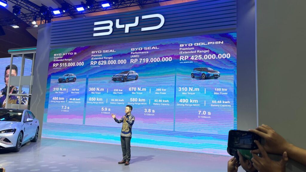 BYD Dolphin dibanderol Rp 425 juta, BYD Atto Rp 515 juta dan BYD Seal Rp 629 juta (varian rendah) serta Rp 719 juta (varian tinggi). Seluruhnya berstatus on the road Jakarta.